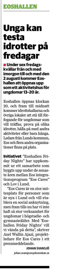 Then, on July 26th, Maria Sehlin reported on "Eoshallen Friday Nights"' success ("Nattidrott för unga en succé"), interviewing people from Eos Cares and EFN's participants: